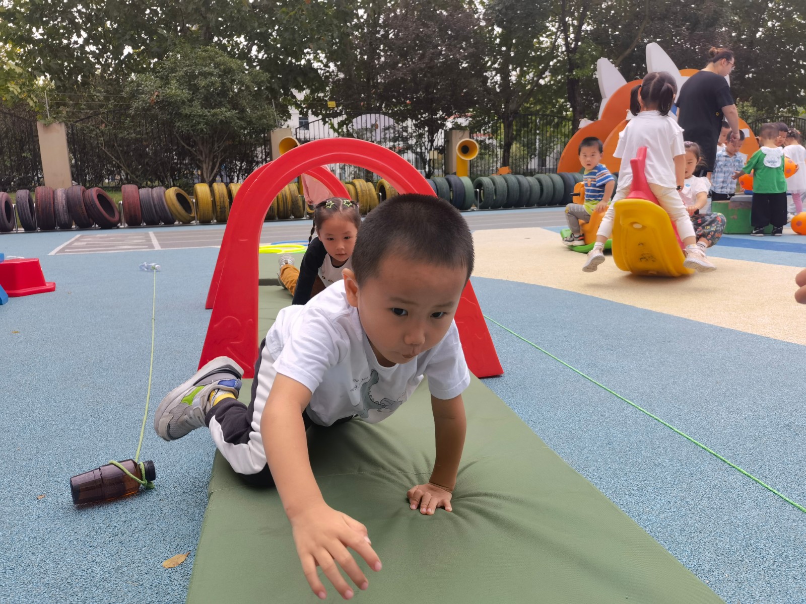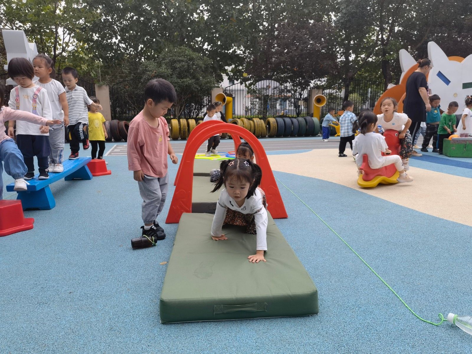 幼儿园里有好多有趣的运动器材,可以跳圈、走平衡木、拍球、钻山洞......还有有趣的滑滑梯~我们一起排排队锻炼身体,身体才会越来越棒哦!
