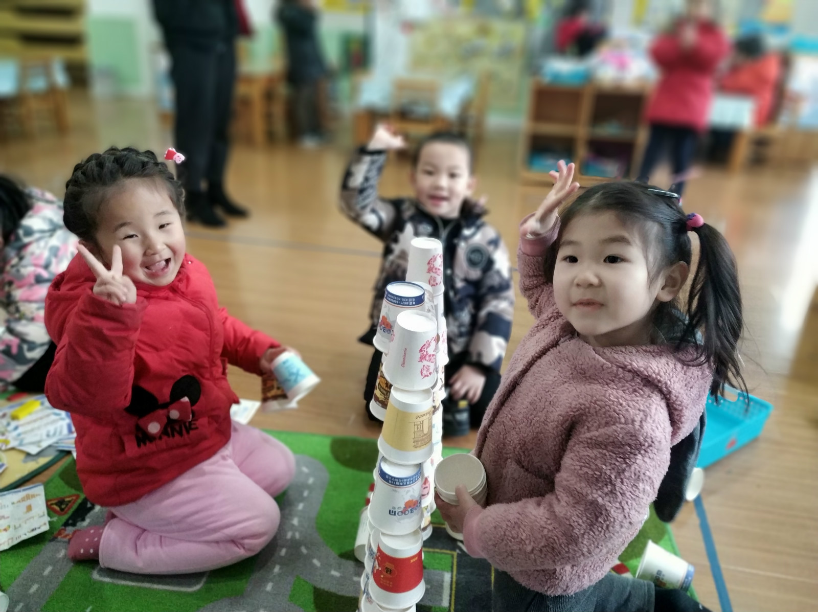 把平常的一次性纸杯成为孩子创作或游戏的素材,给予他们一片尽情想像的空间。搭城堡的孩子脸上都是洋溢自信满足的笑容。通过活动的开展,不仅提高了孩子的动手能力、创造能力、审美能力,而且能帮助孩子逐步形成低碳、环保的意识。